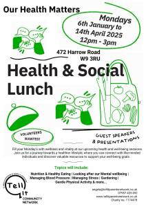 From January 2024, the weekly Drop-in took the shape of a healthy lunch social. We welcome all local people. The aim of the weekly Healthy Lunch Socials is to provide a warm and welcoming space where local people can be informed about health matters, share knowledge and information and take a proactive part in improving their own health. With a FREE healthy lunch.